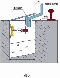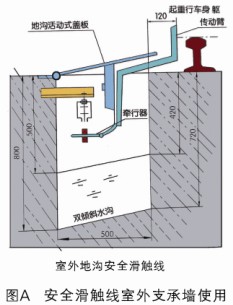 室外安全滑觸線地溝結(jié)構(gòu):垂直安裝圖A、側(cè)面安裝圖B、地溝活動(dòng)蓋板,每0.5米/塊蓋合整個(gè)地溝,支架為基建時(shí)一次性建筑。