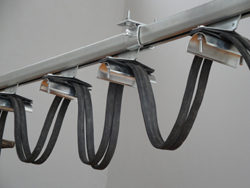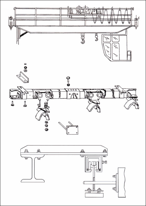該產品的工作原理見工程應用圖示(1)扁平電纜的始端(接現場接線盒)固定于導軋的始端固定器上,再根據現場允許運行的空間,間隔適當的長度(1-2.5mm)依次固定在攜帶電纜的四輪臺車上,電纜未端(接用電源)因定在最后一個小車(牽引車)上。通過拔車上的彈簧拔小車往復移動,通過電纜的拖拽(長度如超過20m應考慮原用牽引繩,使電纜免受拉力)作用,帶動所有的小車在軋道中任意速度自由滑動,導軌安裝簡便,無需調試,且無觸點接觸供電等優點,安全可靠。